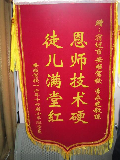 一份耕耘一份收獲,整個暑期的辛苦訓(xùn)練結(jié)束后許多學(xué)員順利的通過了駕駛員考試。在領(lǐng)到駕駛證后,部分學(xué)員仍不忘在安順駕校度過的這個難忘的暑期,不忘教練對自己的辛辛教導(dǎo)。本期,李永芝教練所帶的學(xué)員考試全部通過,順利領(lǐng)取了駕駛證。為表示對教練的感謝,學(xué)員到我校贈送了錦旗。